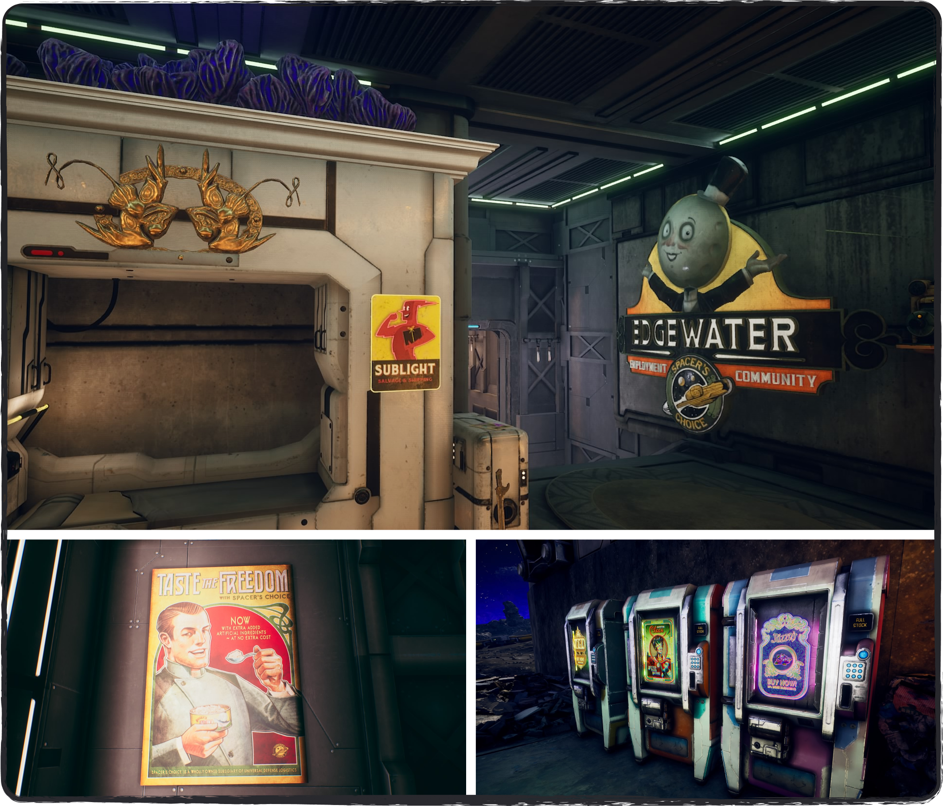When I took my time with it, I also found many aspects of The Outer Worlds that I loved! One thing I loved was searching around and collecting the Science Weapons! These were often hilarious, and the Shrink Ray was probably my favorite. I also really enjoyed the interior of my ship, The Unreliable! It was fun to collect random decorations that filled up the ship throughout the game, as they helped to indicate what I’ve done or who I sided with throughout my journey. I also LOVED the various corporations and their logos/slogans, with the details in the designs greatly enhancing the atmosphere in this game!